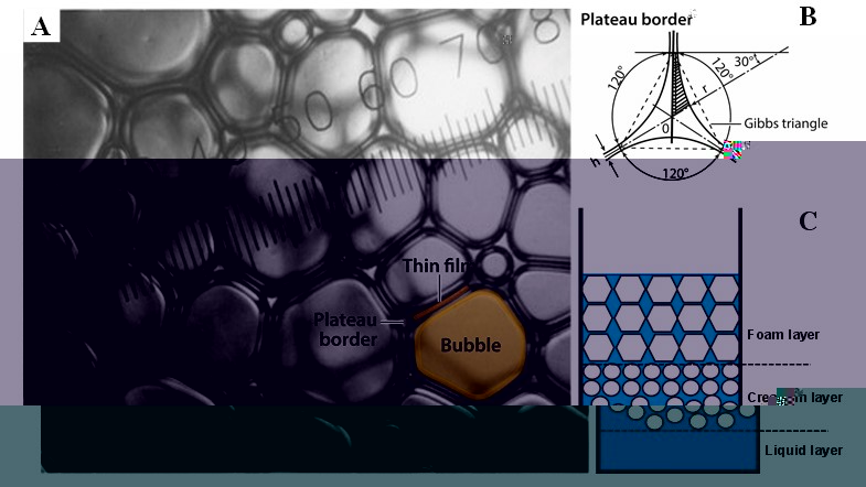 圖1(A)泡沫顯微鏡圖片;(B)薄膜相交形成Plateau邊界;(C)液體層,膏狀層和泡沫層示意圖