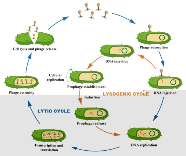 圖2 噬菌體的裂解周期(藍色箭頭)和溶原周期(橙色箭頭)